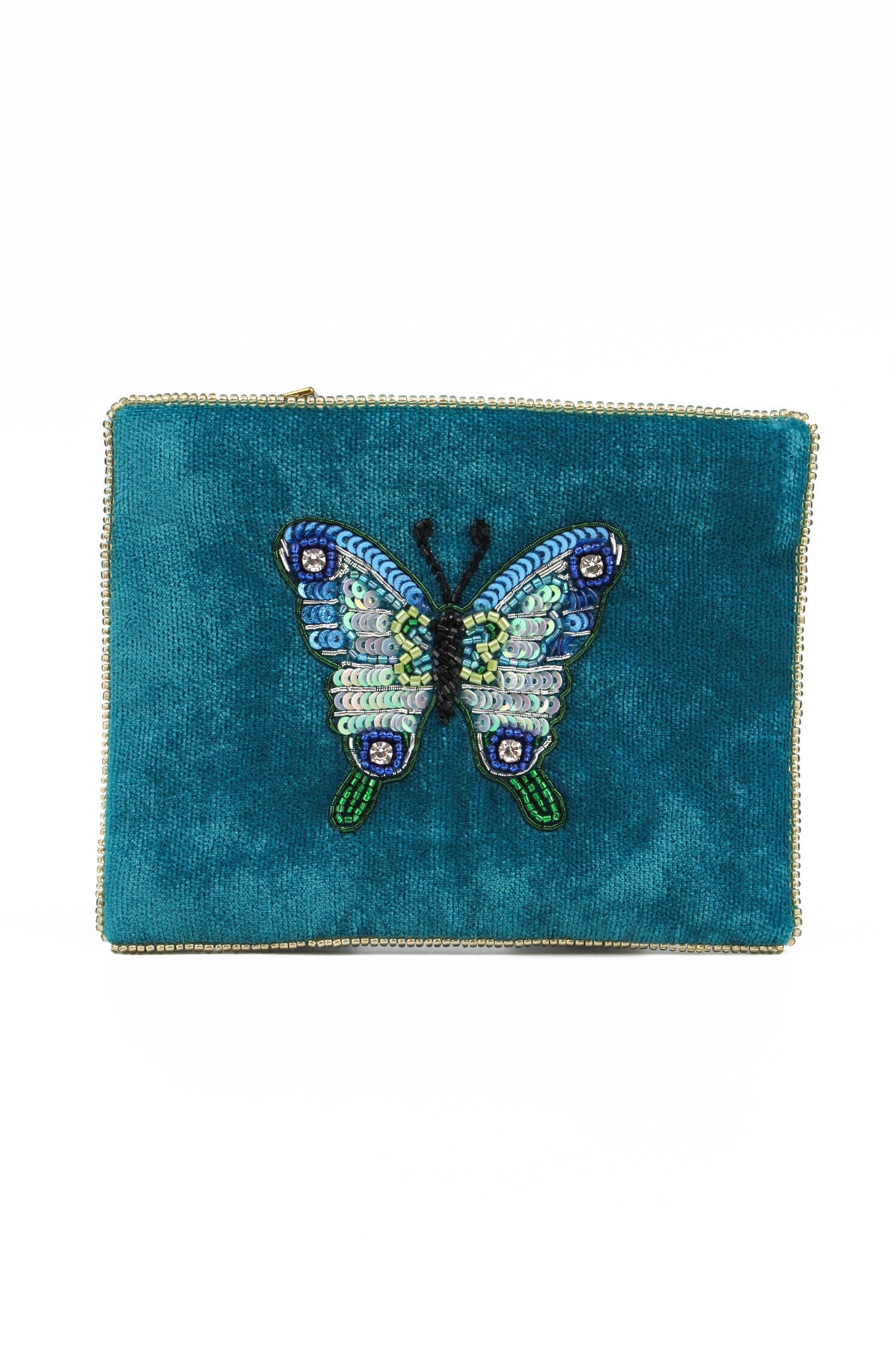 Brighten your day with this delightful blue butterfly pouch - perfect for keeping all your essentials safe. It features an exquisite beaded butterfly motif designed at My Doris - handcrafted by skilled artisans in India.